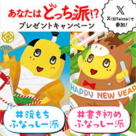 X(旧Twitter)で@274nengaをフォロー して、対象の投稿を引用リポストしてください。その際、「#殿様ふなっしー派」または「#ダービーふなっしー派」のハッシュタグ、コメントを入れて投稿してください。
